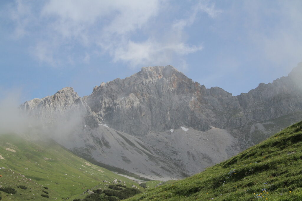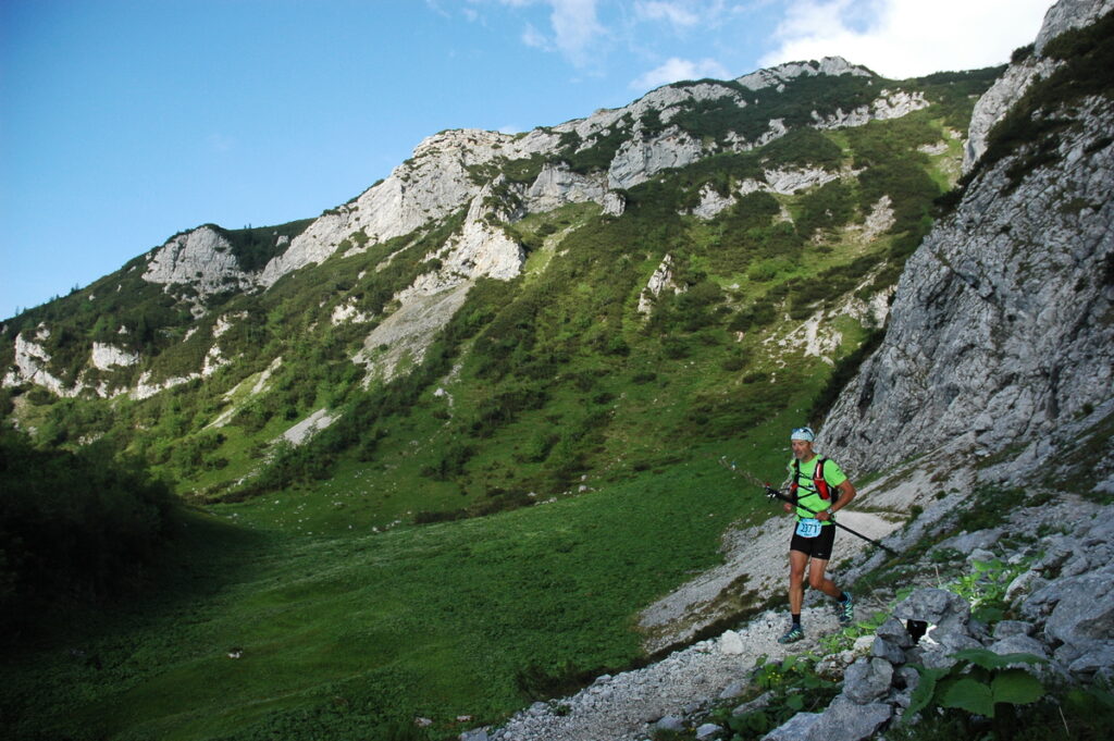 Samstag um 9 Uhr fällt in Leutasch der Startschuss mit dem obligaten musikalischen ZUT Weckruf „Highway to Hell“. Eine halbe Stunde später sind wir Läufer in der langen Steigung zum Scharnitzjoch und jeder ist nun mit sich beschäftigt – das ist Trailrunning. Der Morgen ist magisch, kühle Bergluft, die Aussicht auf die Berge wird frei, der Körper arbeitet. Mein Formaufbau war 2014 auf April ausgerichtet. So ist es für mich klar, dass ich heute etwas dosiert laufen muss. Dass ich die Strecke kenne, hilft mir bei der Einteilung sehr. Die sechs Verpflegungsposten sind bestens ausgestattet. Ich esse Melonen- und Orangenschnitze, Salzgebäck und trinke meistens nur Wasser, gegen Ende auch Cola. Einmal helfen ein Brownie und ein guter Kaffee gegen die langsam aufkommende Abneigung gegen Essen. „All you can eat“, und das alle paar Kilometer — eigentlich seltsam, dass nicht mehr Leute diese Gelegenheit nutzen 😉