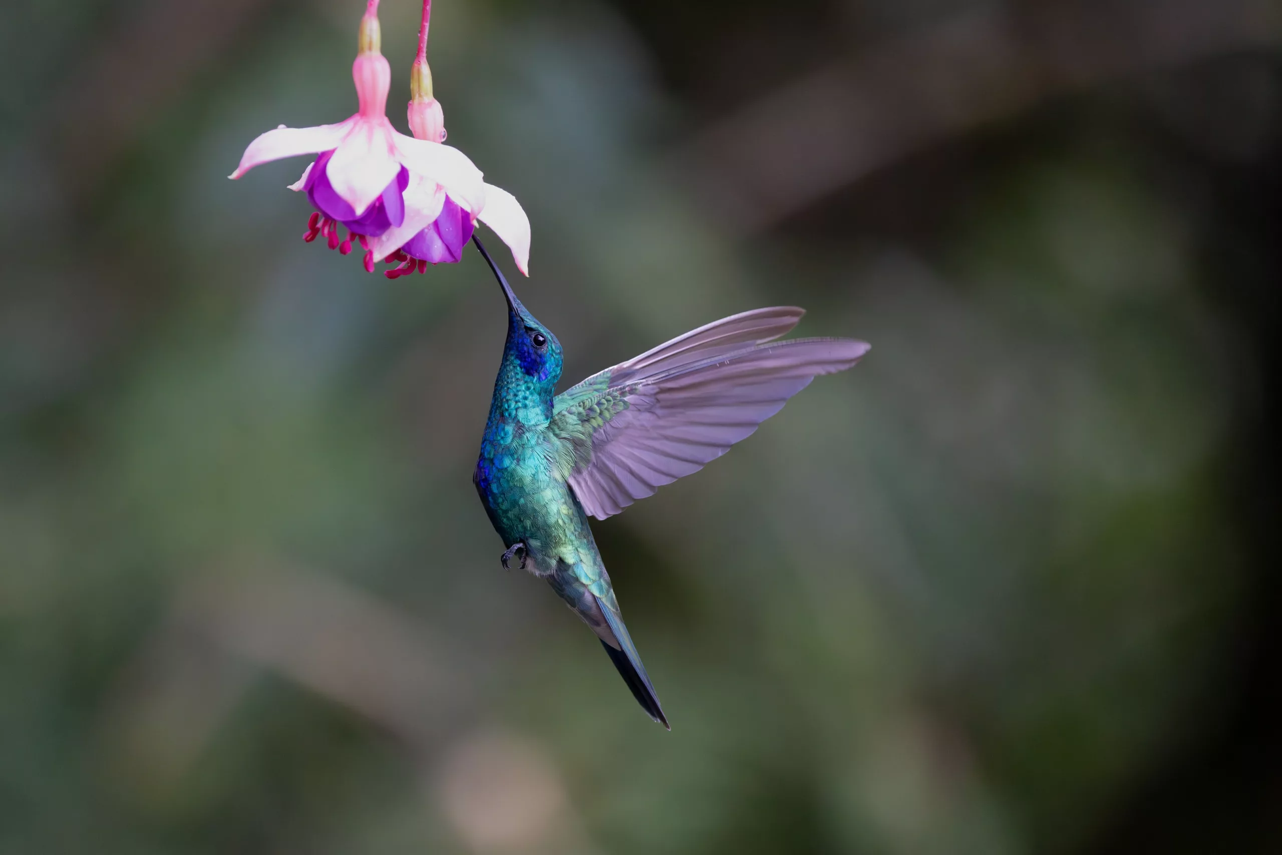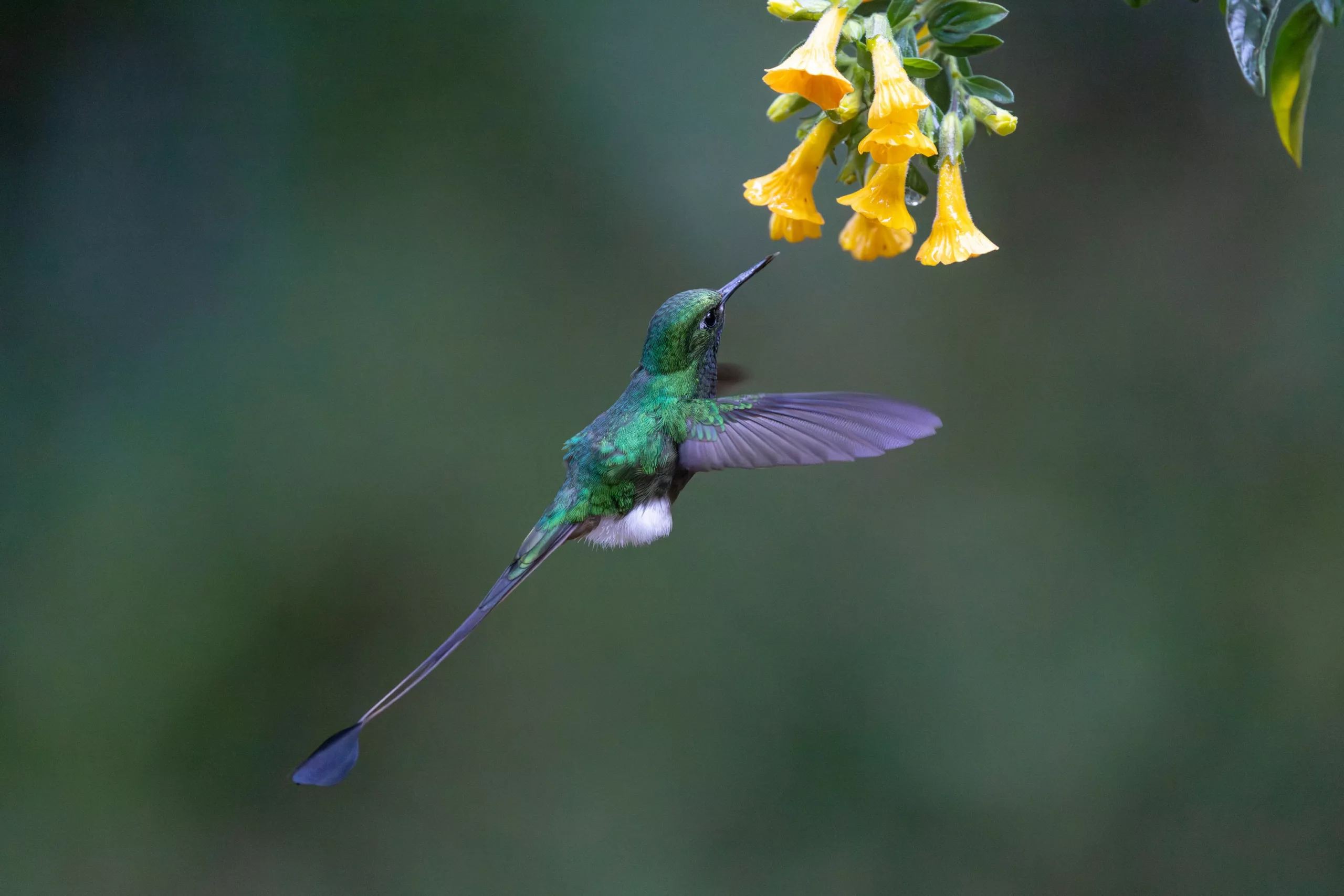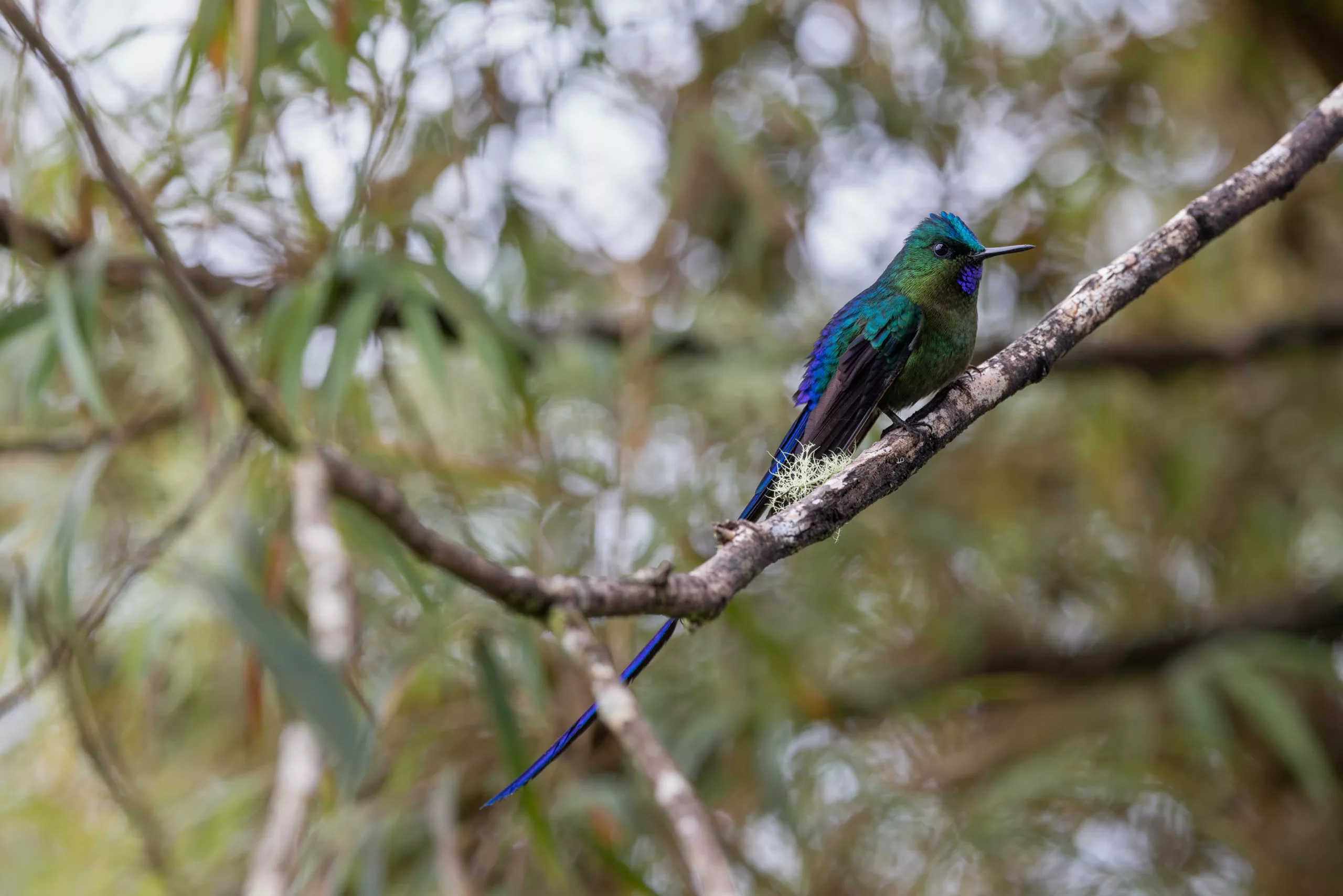 Great Sapphirewing, Pterophanes cyanopterus. Rechts: Long-tailed Sylph (m), Aglaiocercus kingii. Diese beiden Kolibriarten gehören zu den grösseren Species. Während dies beim Long-tailed Sylph dem beeindruckend langen Schwanz zu verdanken ist, sind Sapphirewings mit ihren gut 16 cm Körpergrösse wirklich beeindruckende Erscheinungen und damit auch eine der grössten Kolibri-Arten überhaupt. Die Sylphen verhalten sich in Gegenwart anderer Arten eher ruhig und zurückhaltend. Sapphirewings sind typische Paramó- und Elfin Forest-Bewohner; in tieferen Lagen unter 2500 m fühlen sie sich nicht wohl.