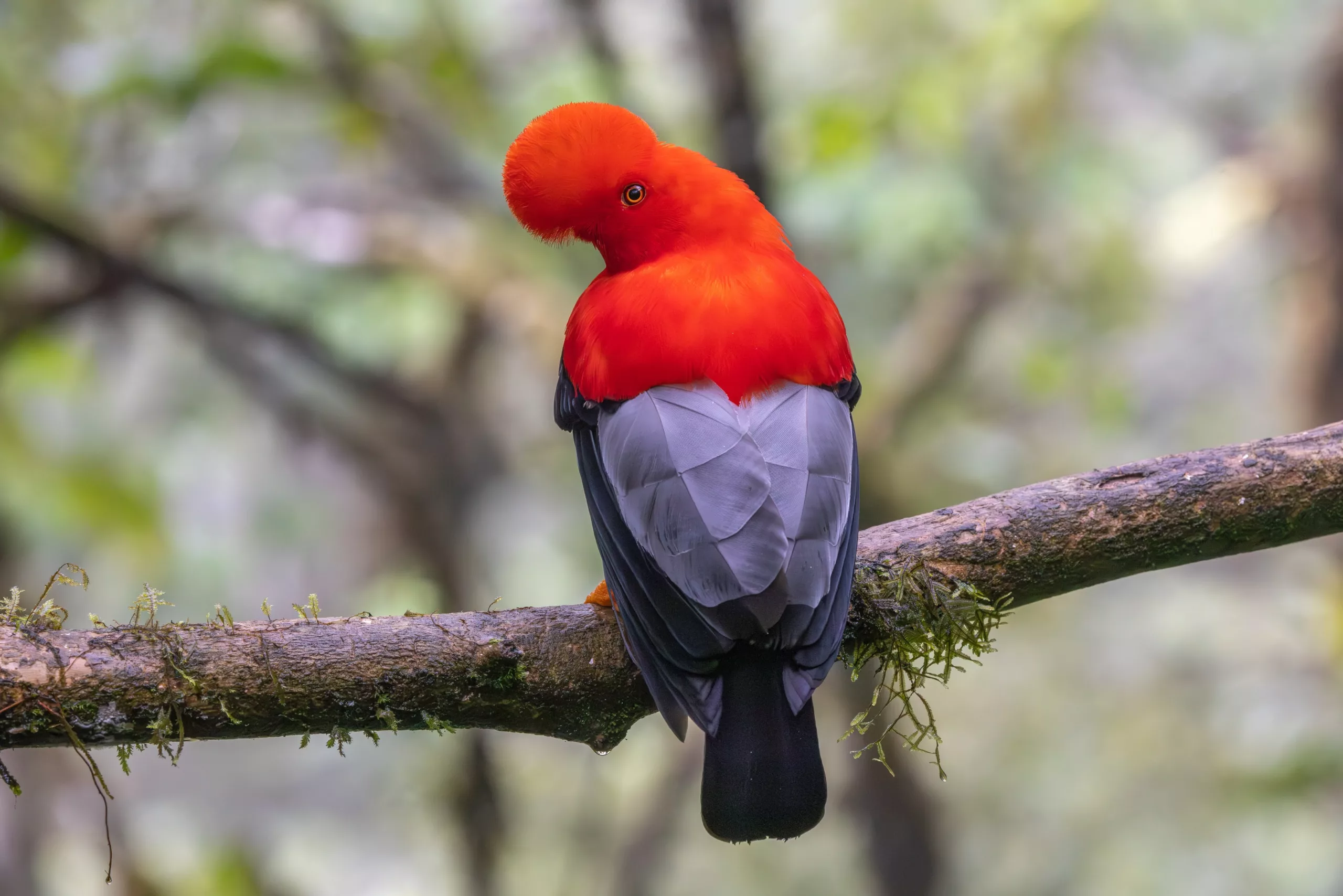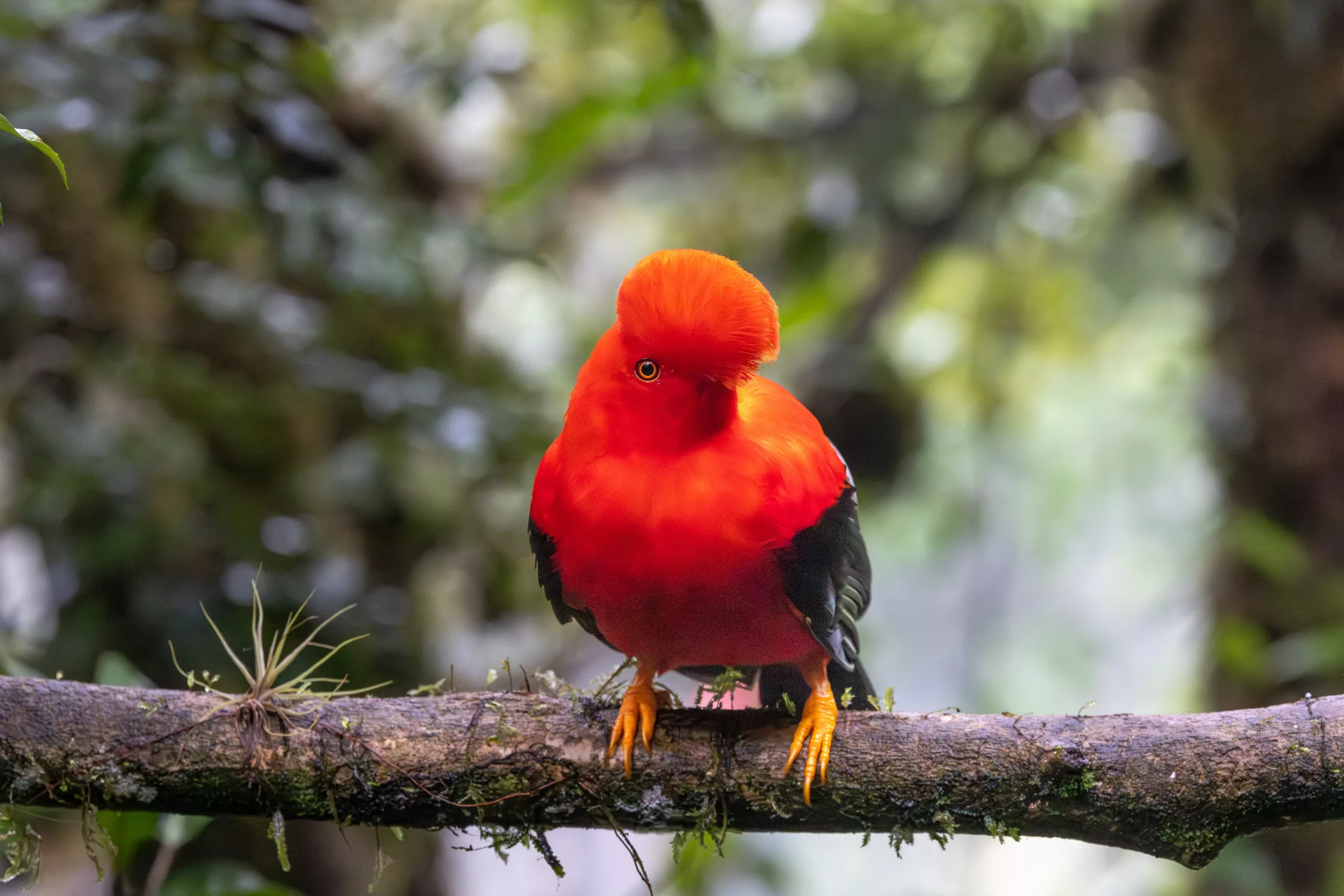Andean Cock of the Rock, Lupicola peruvianus (m). Für die berühmten Felsenhähne, die man wohl einfach gesehen haben muss, sind wir sehr früh aufgestanden, da sich die Männchen jeweils nur am frühen Morgen für etwa eine halbe Stunde an ihrem Balzplatz versammeln. Eindrückliche Vögel, bestimmt – aber, ganz ehrlich, mit ihrer orangen Hauben wirken sie schon leicht «bedeppert» ….