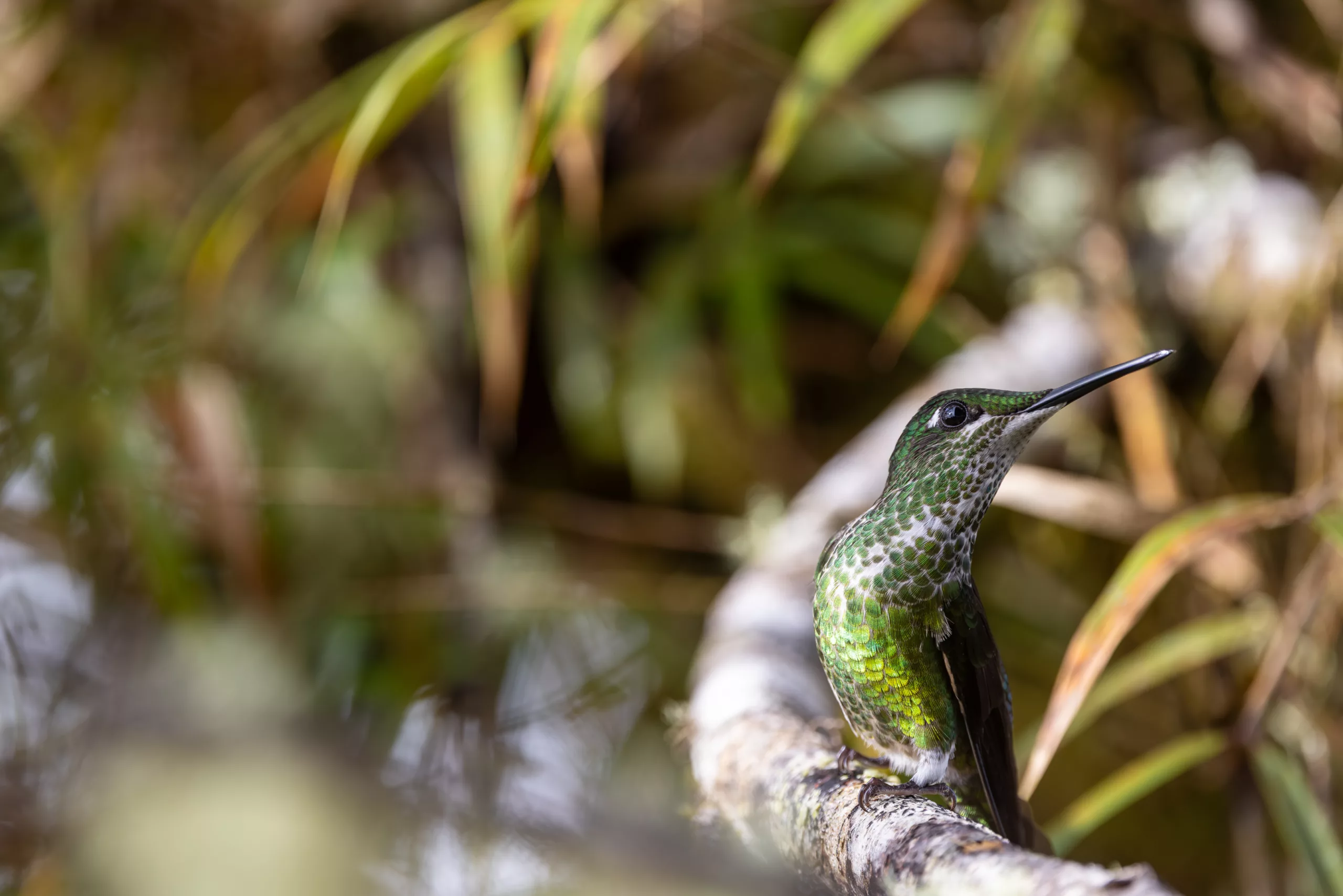 Kolibris sind äusserst streitsüchtig, wenn es um Blüten bzw. Futter geht. Da wird gekämpft, verteidigt und wilde Verfolgungsflüge sind die Folge. Da kann das Teleobjektiv schon einmal als Ruheplatz ausgewählt werden. Wir haben ab und zu eine Blüte mit einer Spritze mit Zuckerwasser beträufelt. Es kann sein, dass ein Kolibri diese Blüte von seinem Standplatz aus rigoros verteidigt. Am besten präpariert man eine weitere Blüte. Dieses Verfahren und die Geduld an Blüten, die sowieso genügend Nektar haben, ermöglichte einige der folgenden Aufnahmen und führte zu viel Unterhaltung. Von den gut 160 Kolibri-Arten in Kolumbien konnten wir gut 30 Arten beobachten und bestaunen. Vom Tiefland bis in die Bergnebelwälder leben diese einzigarten Vögel.
