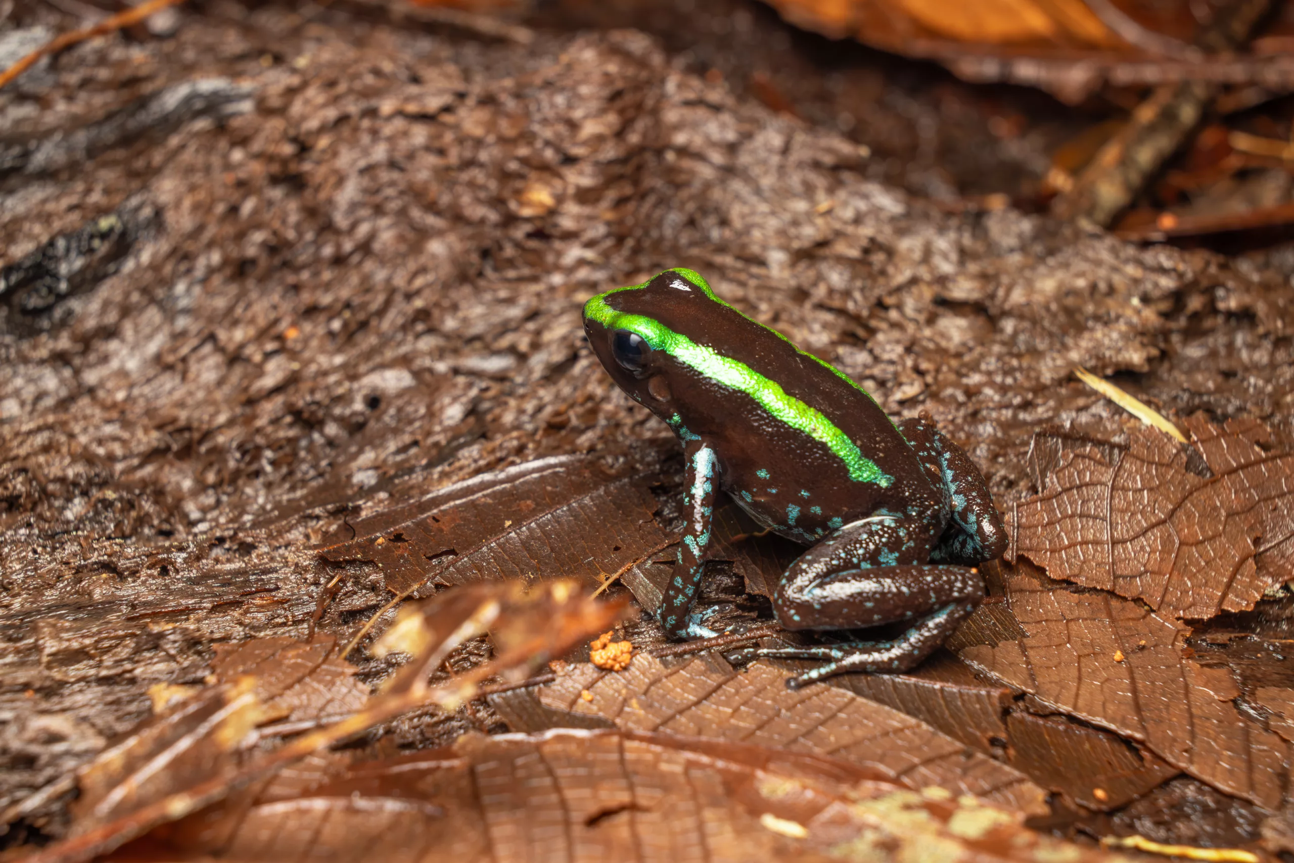 Andinobates minutus. Diese Art gehört zu den kleinsten Vertretern der Pfeilgiftfrösche. Der kleine Kerl machte es uns nicht einfach, ein paar Fotos zu machen. Rechts: Phyllobates aurotaenia. Sein intensives Rufen machte uns auf ihn aufmerksam. Trotz seiner auffallenden Warnfarben ist er auf dem dunklen Waldboden nicht einfach zu entdecken. Dieses Fröschchen zählt zu den Top 3, wenn es um ihre Giftigkeit geht. Das starke Nervengift auf der Haut dieser Tiere wurde tatsächlich für das Vergiften von Blasrohr-Pfeilen verwendet, während bei vielen anderen Arten dies kaum oder nicht praktiziert wurde. Die Bildung des Giftes hängt stark vom Futterangebot und wohl auch anderen Umweltbedingungen ab. In der Terrarienhaltung baut sich das Gift stark ab, und es wird kein neues mehr gebildet.